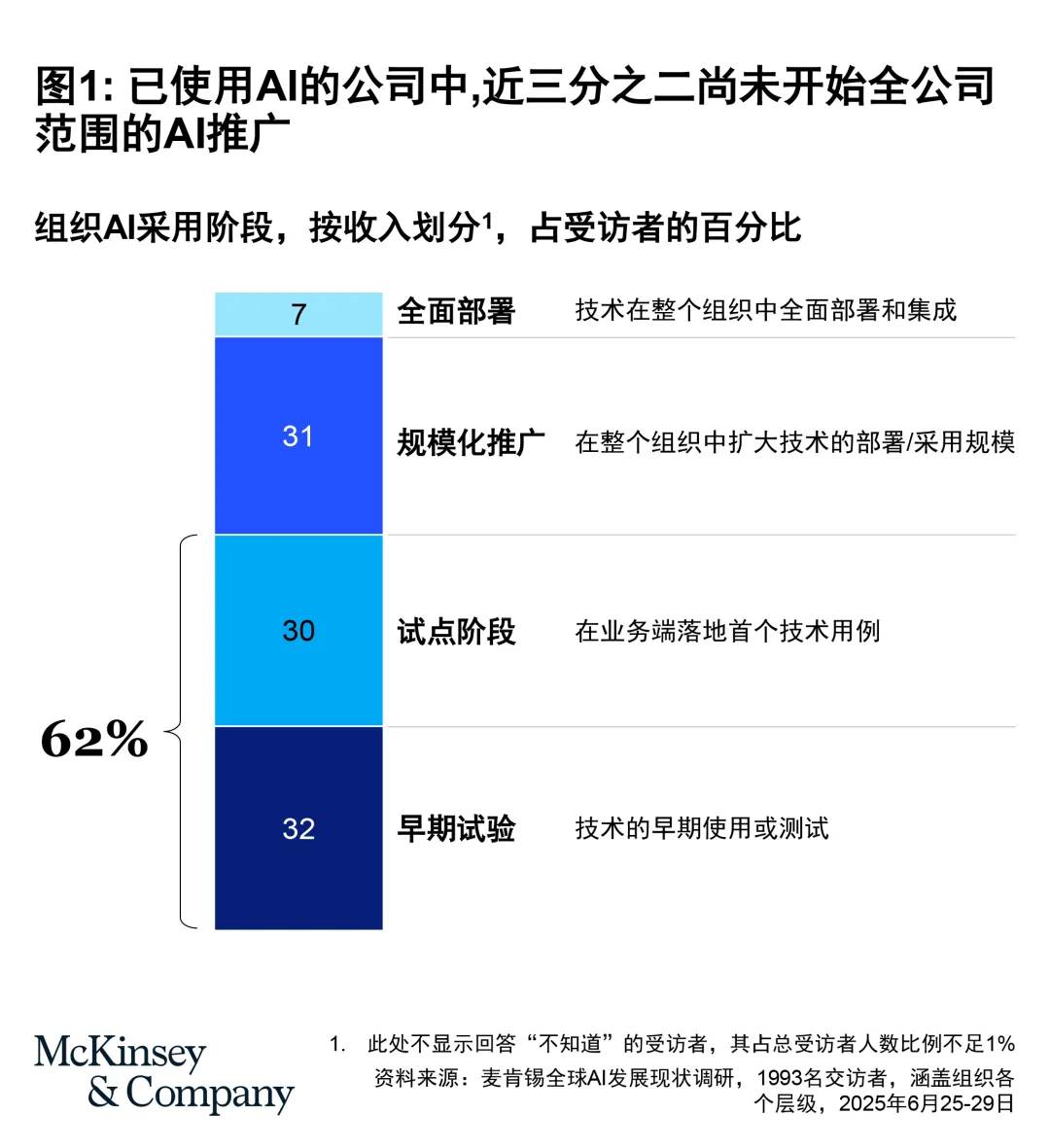相关调研数据也印证了这一点。根据2025年麦肯锡全球AI应用现状研究,仅约1/3企业实现了AI在全公司范围内的推广应用;中国企业的整体进展与全球基本一致,多数仍停留在探索或试点阶段,尚未实现对业务的深度赋能。