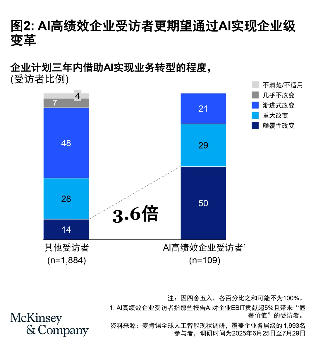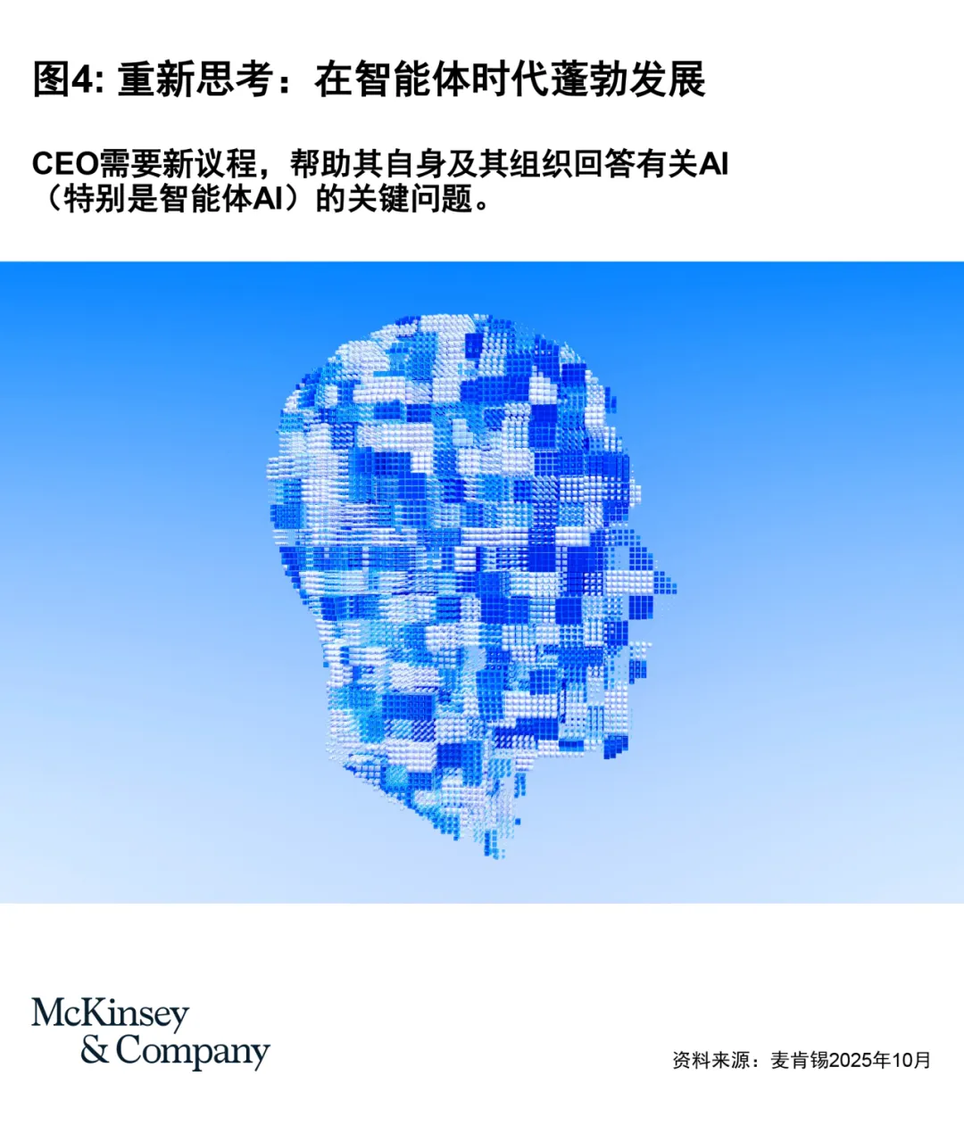相比之下,AI高绩效企业(EBIT因AI提升超过5%且创造显著价值)展现出明显的共性:以业务价值为导向,将AI视为推动组织重塑的催化剂,而非单纯的效率工具,主动探索适配产业的人机协动模式;重视工作流程的根本性重构,优化组织模式、调整人才结构,将AI深度嵌入端到端业务流程,实现人机高效协同;具备强有力的高层背书和系统化的落地机制,增加AI资源投入,推动技术与组织、人才的协同升级。这与麦肯锡推进科技转型、搭建人机协动体系的实践逻辑高度一致。这种“战略-组织-人才-人机协同”四位一体的布局,正是AI转型成功的核心关键,也为中国企业提供了重要借鉴。
