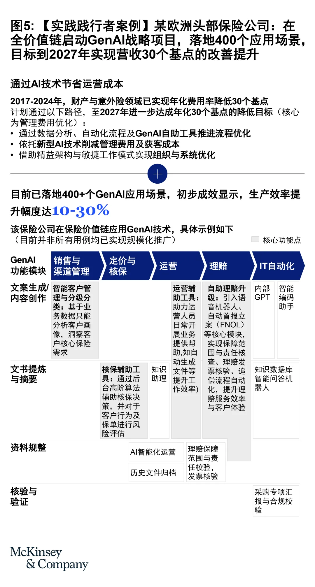 某欧洲头部保险公司在AI转型中,CEO亲自入局,推动AI在组织各层级的深度嵌入。他主动学习AI知识,亲自使用工具,示范好奇心、能力与责任感,带动高层及全员参与转型。针对员工对AI的顾虑,他亲自牵头建立清晰的AI治理机制,提高数据质量、明确决策权,积极回应员工关切,增强员工对AI的信任。同时,他亲自推动项目落地,聚焦销售、核保、理赔等核心场景,建立清晰的AI绩效衡量标准,跟踪AI应用成效,及时优化调整AI应用策略。在CEO的推动下,该保险公司已落地400个GenAI应用场景,生产效率提升10~30%,真正实现了转型见效,也印证了CEO实践对AI转型成功的重要意义。