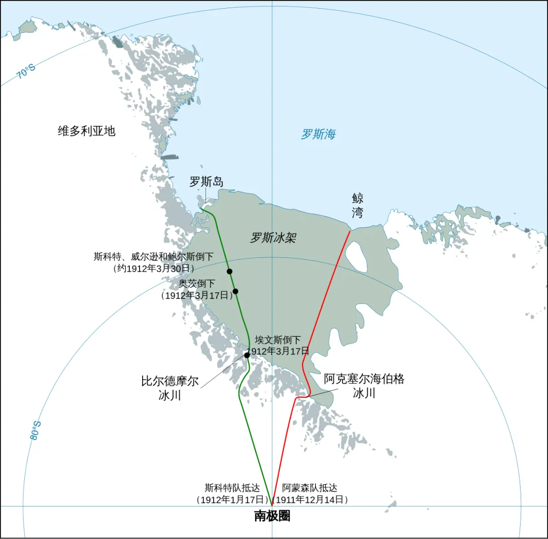 斯科特于1912年1月17日抵达,返程中因极度低温、脱水和饥饿而牺牲。