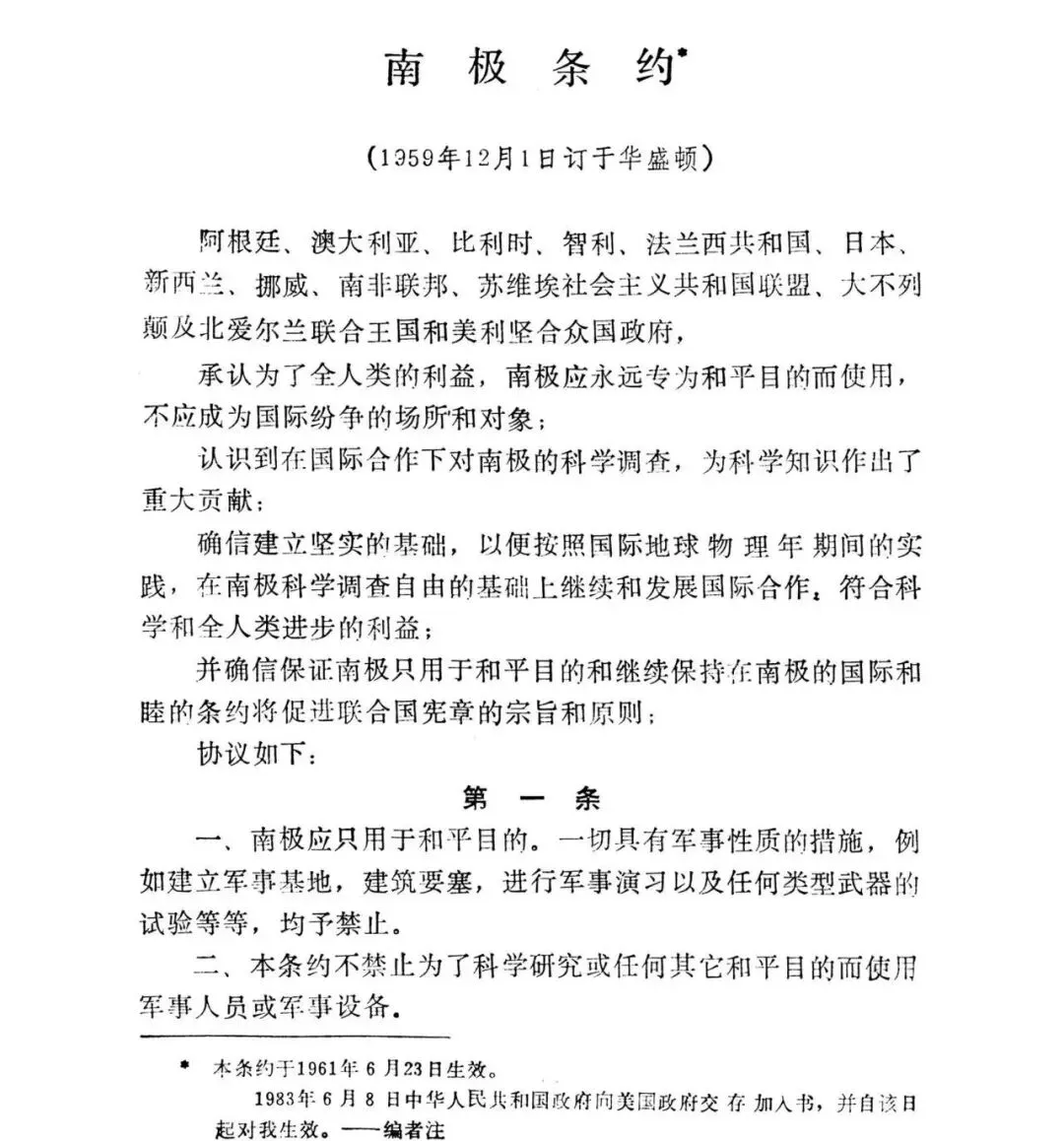 1959年签署的《南极条约》将南极定为“和平与科学的专属区域”:禁止军事活动、核试验与资源掠夺,目前已有50多个国家加入