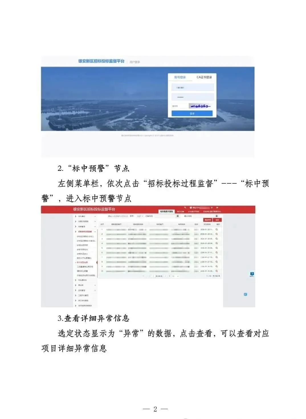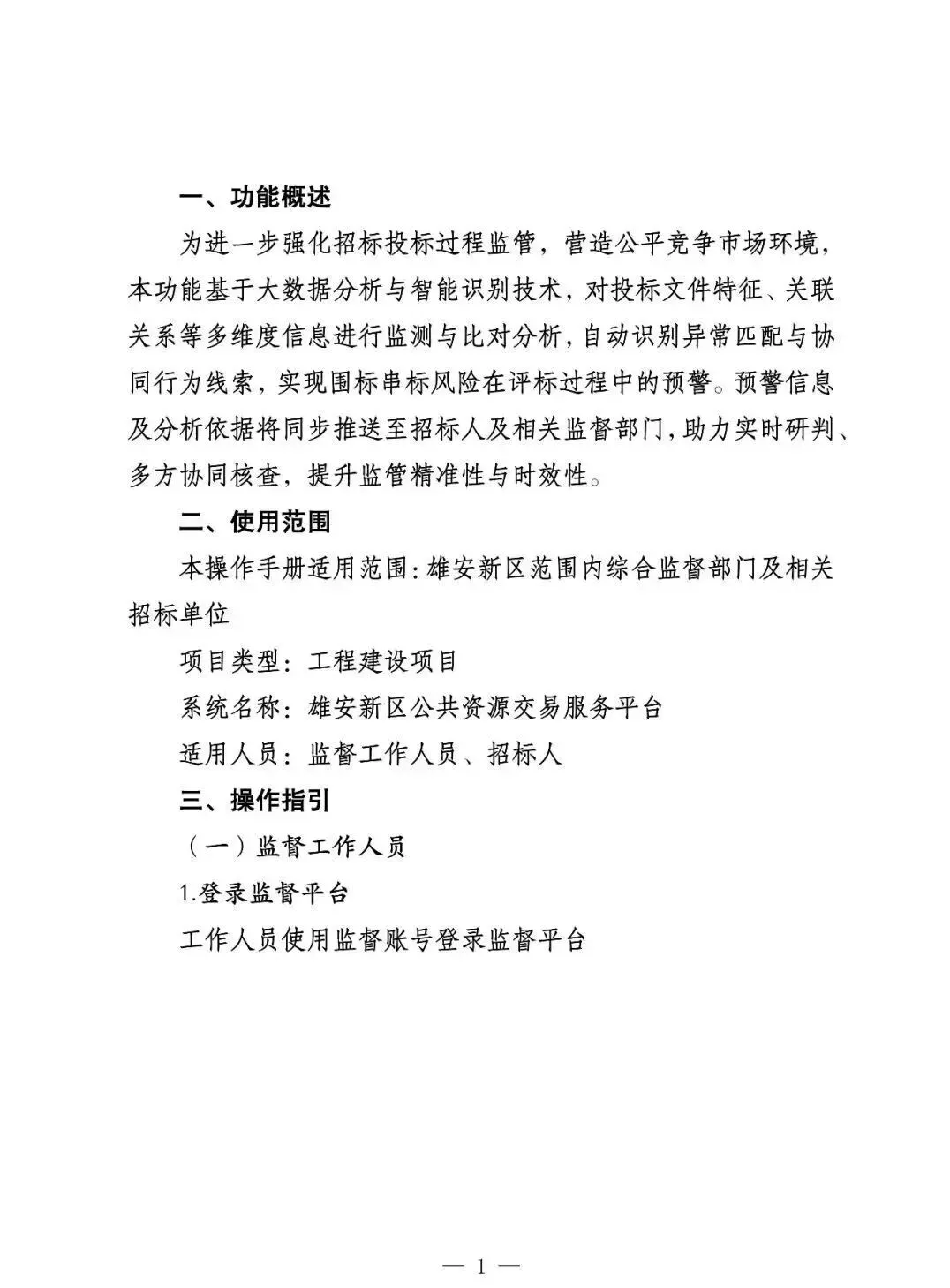 请各单位高度重视“标中预警信息推送”功能模块的上线运行,迅速组织学习《标中预警信息推送功能操作手册》,全面熟悉系统操作流程与预警处置规范,确保相关人员熟练掌握、规范使用。要严格执行预警接收与研判机制,对推送的预警信息做到及时接收、精准研判,并依法依规、规范高效地开展核查处置工作,切实筑牢评标环节风险防控屏障,有效维护雄安新区公平公正、规范有序的市场竞争秩序。