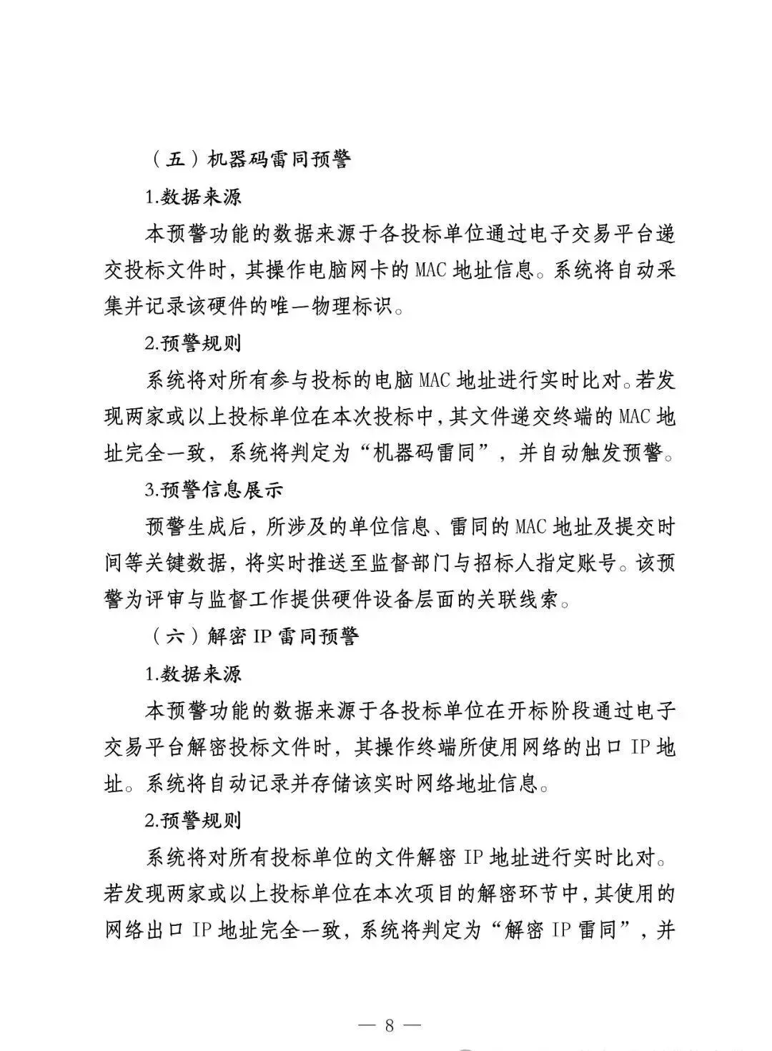 系统将对所有参与投标的电脑MAC 地址进行实时比对。若发现两家或以上投标单位在本次投标中,其文件递交终端的MAC地址完全一致,系统将判定为“机器码雷同”,并自动触发预警。