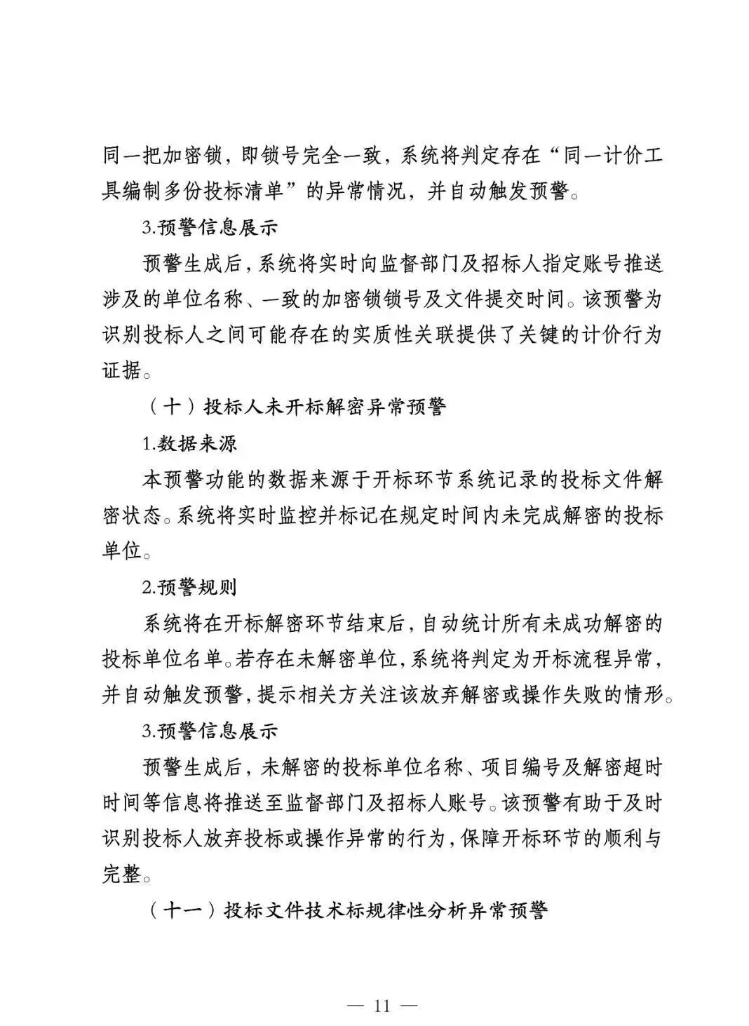系统将对所有投标单位的技术标异常点数量进行统计与横向比对。若发现某投标单位的格式异常点数量显著高于平均水平,或存在多次检测均出现同类异常未修改的情形,系统将判定为技术暗标检测异常,并自动触发预警。