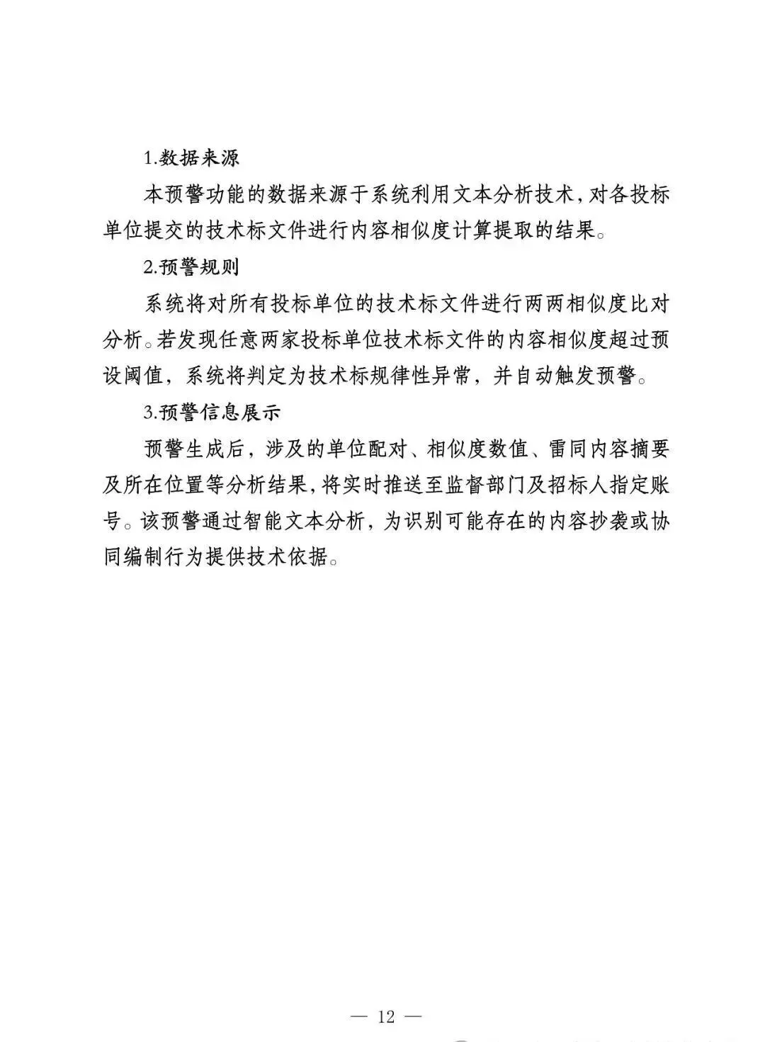 系统将对所有投标单位的技术标文件进行两两相似度比对分析。若发现任意两家投标单位技术标文件的内容相似度超过预设阈值,系统将判定为技术标规律性异常,并自动触发预警。
