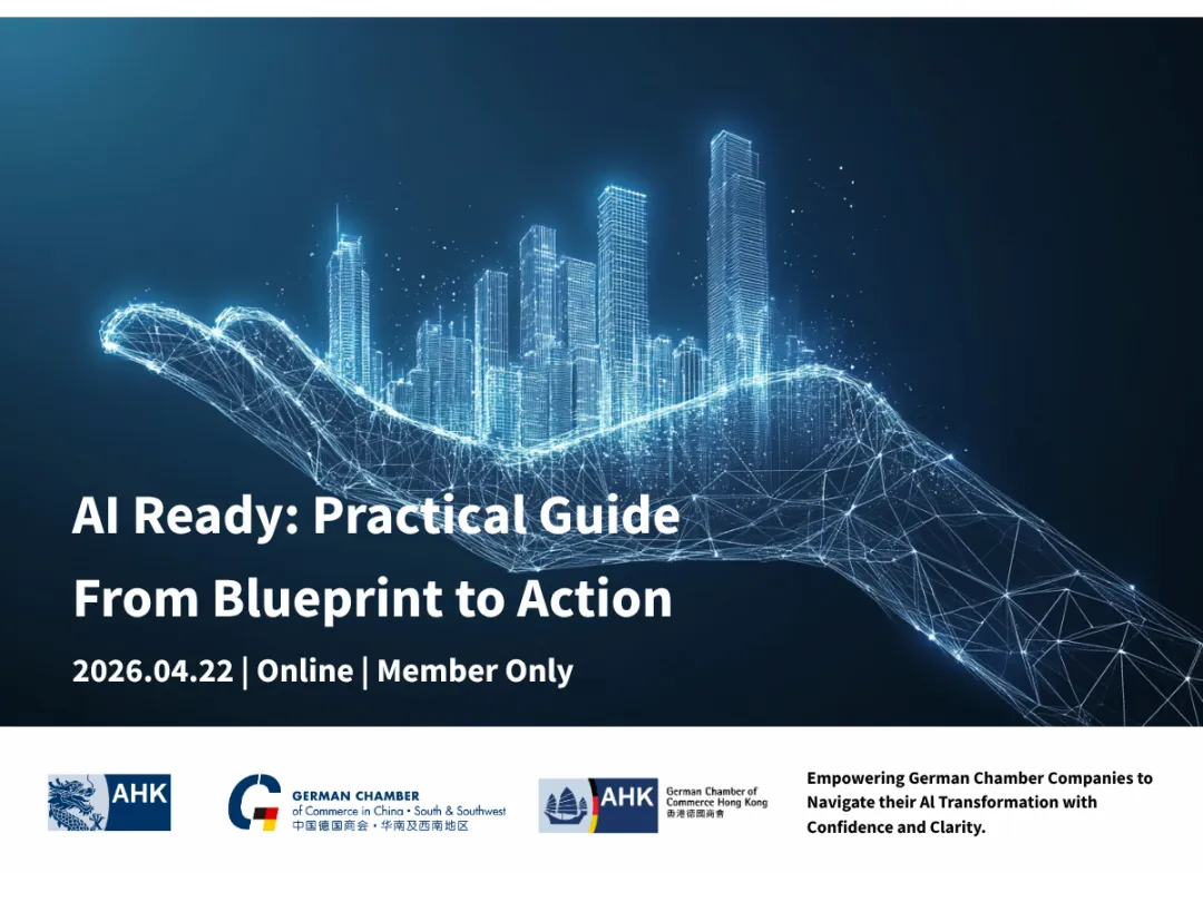 AI adoption is no longer a question of if but how. To support our members on this journey, the German Chamber of Commerce in China · South & Southwest, together with GCC Hong Kong, will hold a member-exclusive online session with the AI Business Transformation Blueprint.