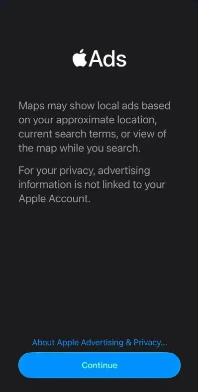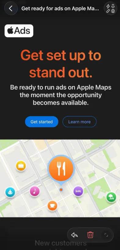 地图内出现 Apple Ads 付费推荐位(商家广告) 系统将通过 "Suggested Places" 展示付费推荐位,为用户推荐附近的游览地点。 首次打开地图弹出授权提示 仅限美 / 加测试,国行暂不可见
