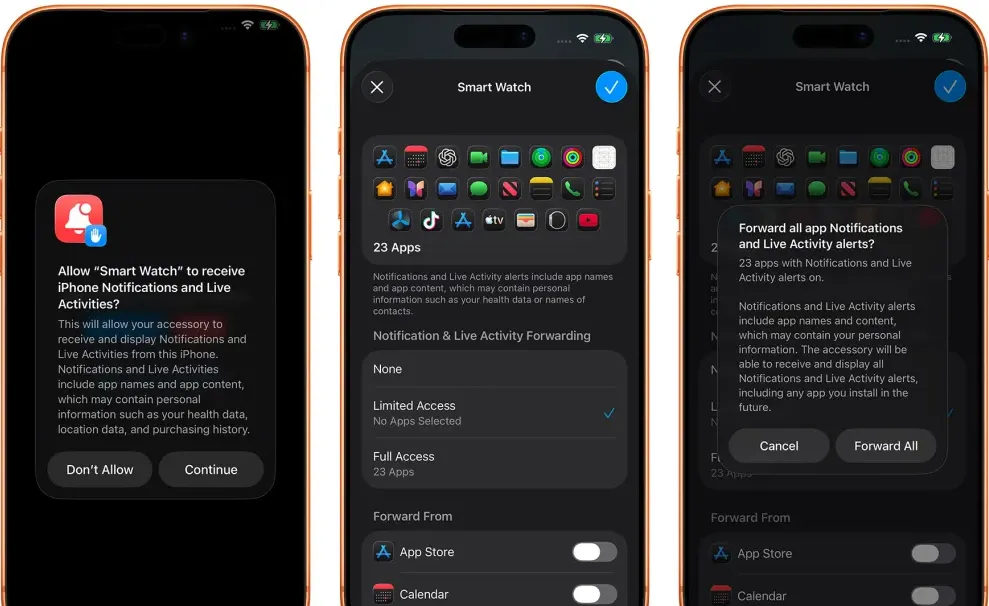 要启用该功能,用户将被提示授予附件权限以接收 iPhone 的实时活动。系统会显示授权对话框,说明实时活动可能包含“应用名称和应用内容,可能包含你的健康数据、位置数据和购买历史等个人信息