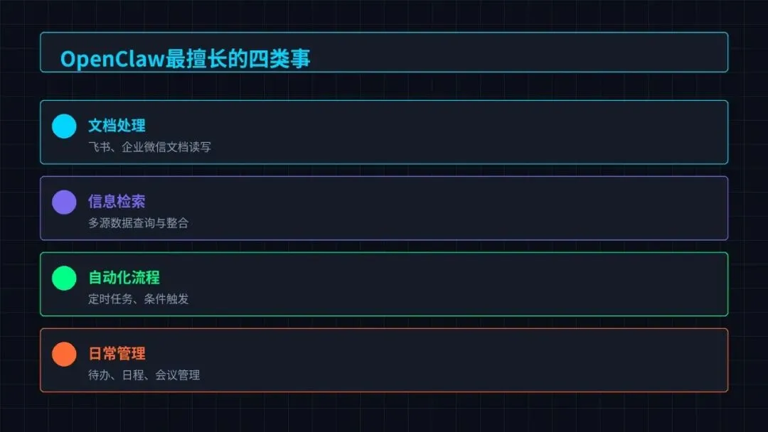 OpenClaw最擅长四类事:文档处理、信息检索、自动化流程、日常管理。