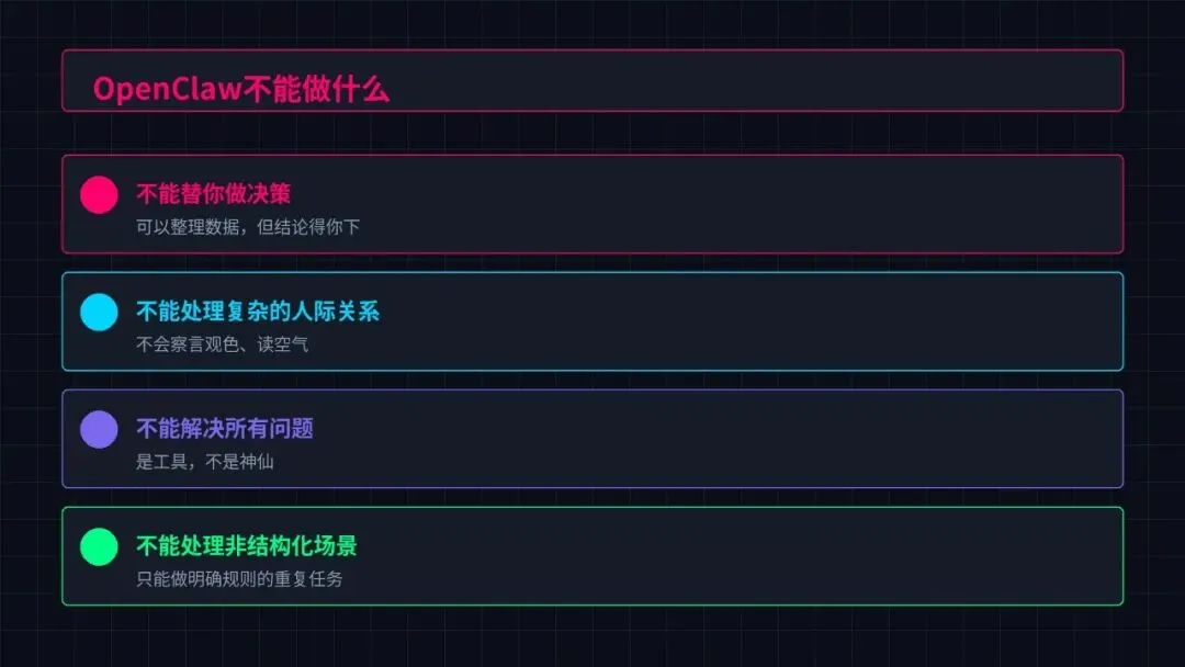 不能替你做决策。 它可以整理数据、生成报告,但分析结论得你下。它可以列出选项的优缺点,但选哪个还是你说了算。