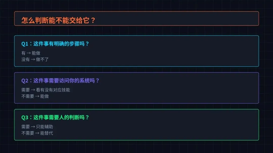 判断一件事能不能交给它,就看三点:有没有明确步骤、有没有对应技能、需不需要人的判断。