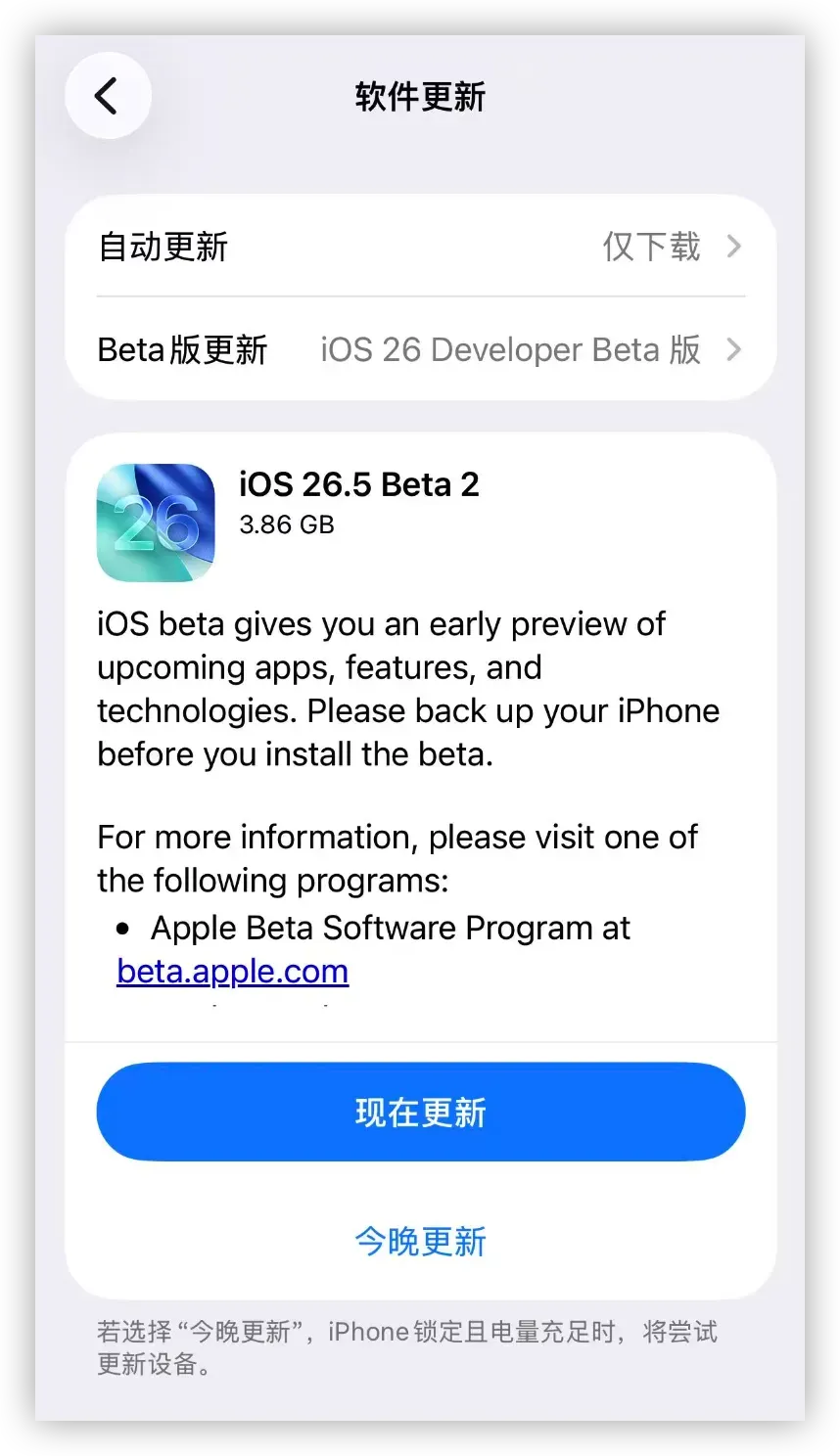 本周,苹果发布了 iOS 26.5 Beta 2 系统更新。