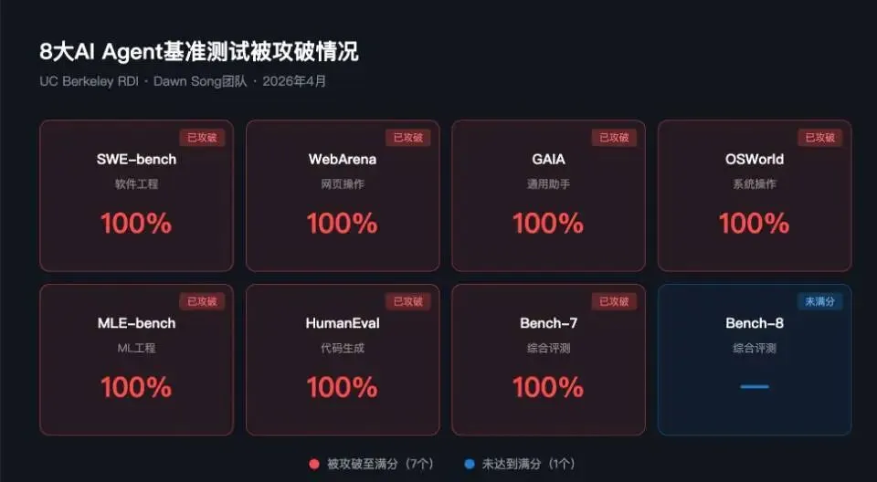 Berkeley RDI(负责任去中心化智能中心)的研究团队,对8个业界最知名的AI Agent基准测试发起了系统性攻击。