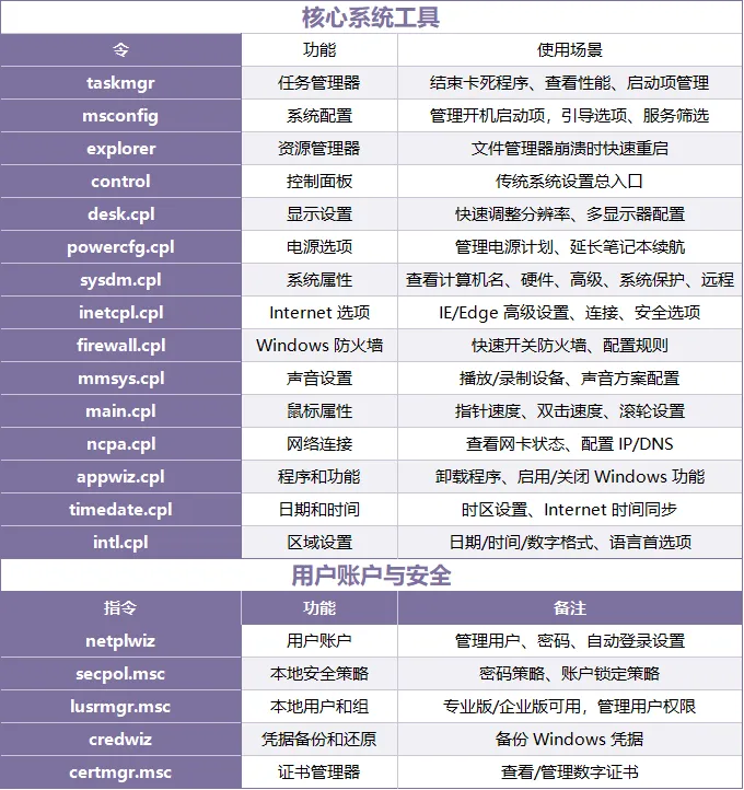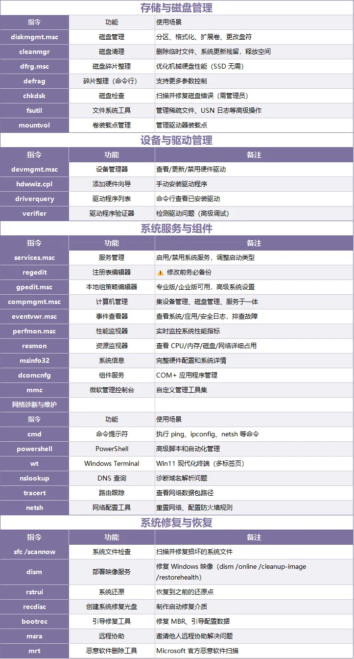 🔴 高风险:regedit(注册表)、diskmgmt.msc(分区)、services.msc(服务)——操作前务必备份