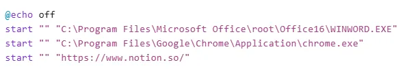 保存为 work.bat,Win+R work 同时打开 Word + Chrome + Notion