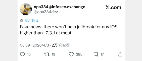 在4月3日上午时段,opa334 越狱大佬在 X 推特上回应称,A12+ 设备大于 iOS 17.3.1 系统的设备目前是没有越狱的可能,但也不建议你们升级,耐心等待新的消息出现,现在突破不了,不代表以后不行。
