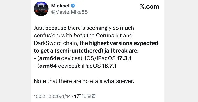 关于新版 iOS 越狱的支持范围,博主 Michael 在 X(推特)上发布消息称,不少用户对 Coruna 和 DarkSword 漏洞存在质疑,不确定能否实现越狱。针对这一问题,Michael 直接作出解答,为大家厘清疑惑。
