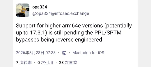 意思是 A12+ 设备 iOS 17.4+ 系统具有完整越狱的可能性是无,但低于 iOS 17.3.1 系统,则就有望越狱,但不会那么快,因需要逆向分析 PPL 和 SPTM 绕过,还需要耐心等待。