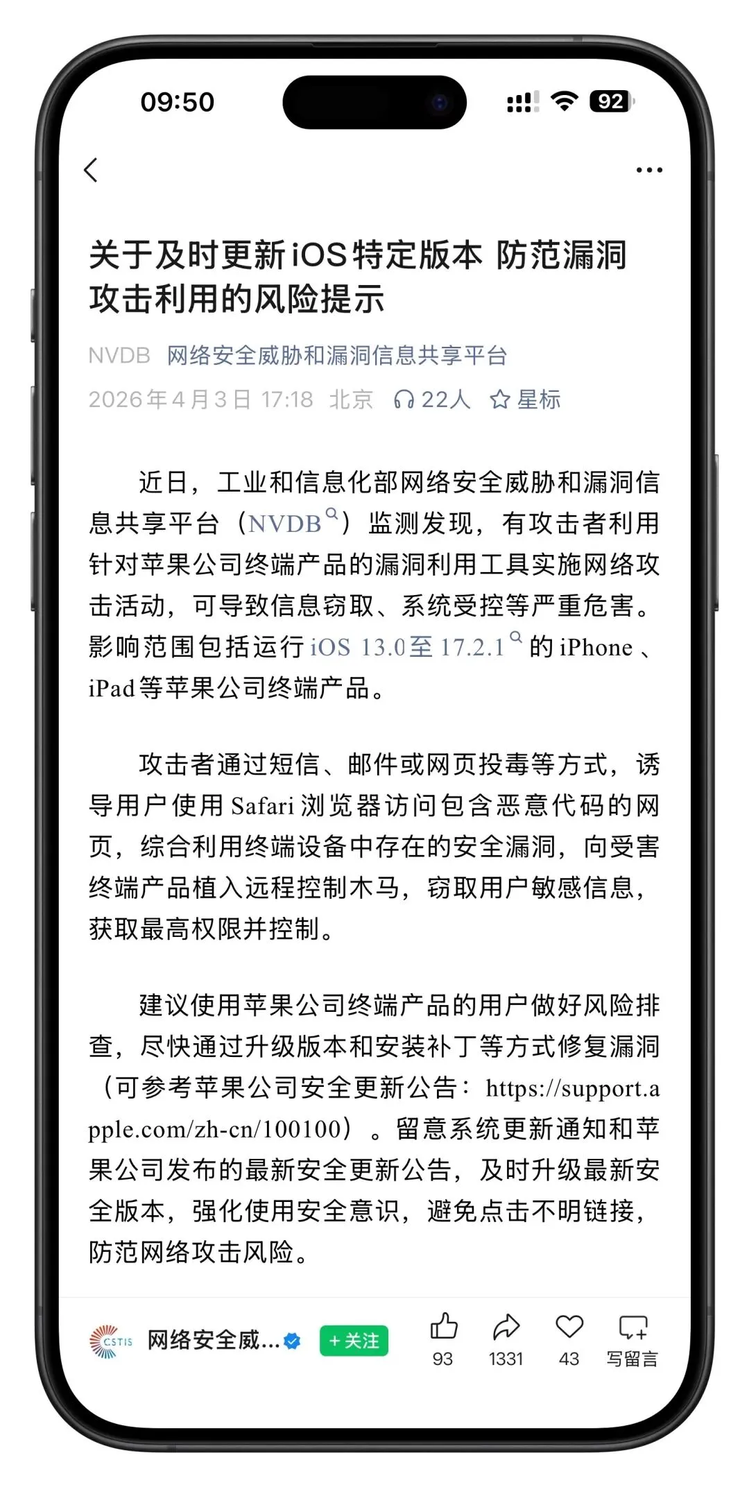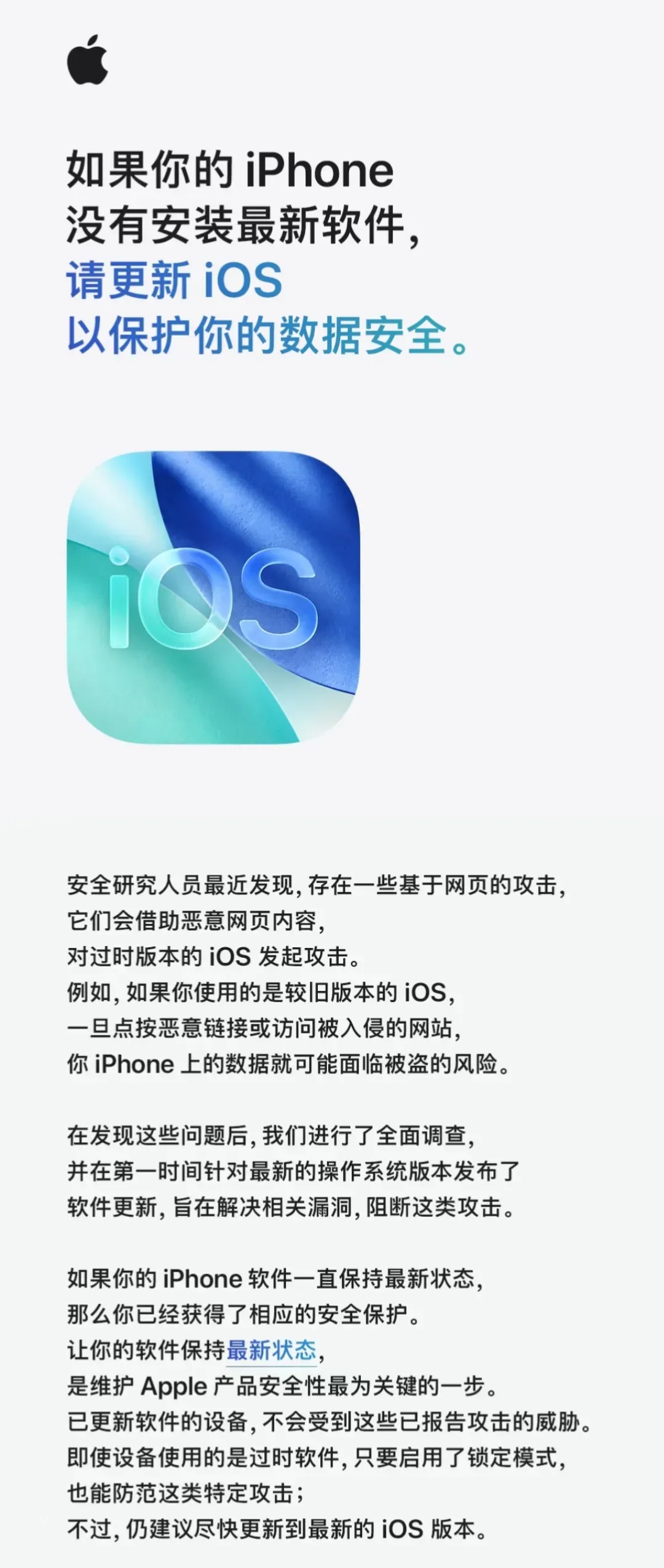 Apple 官方紧急发布了一篇安全提醒文章,建议部分机型尽快升级到新系统版本,相信此前不少机友都在网上看到关于 WebKit 漏洞的事情,影响范围包括iOS 13.0 至 iOS 17.2.1 工信部也提醒苹果用户尽快升级系统。