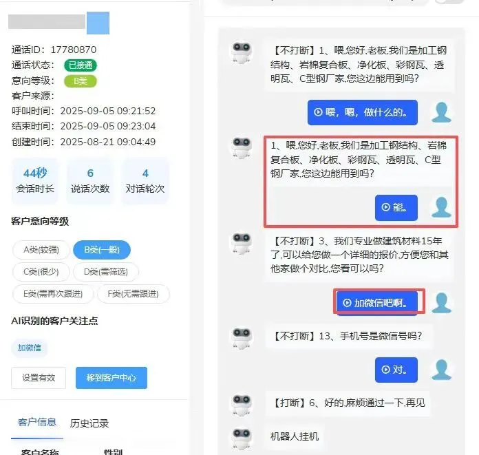 4、通过ai机器人外呼系统筛选出来的意向客户会根据意向程度自动分类意向ABCD等级并推送到员工的微信上,可以有效帮助企业提高拓客率。