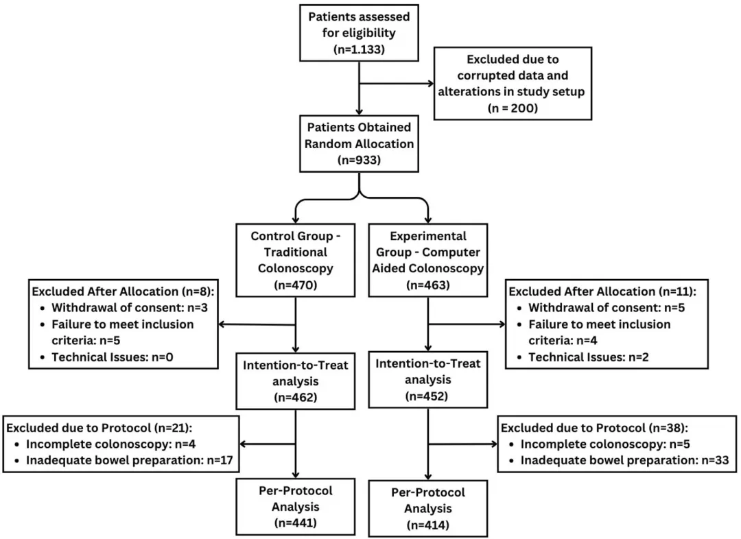这项研究从2021年11月到2022年11月,找了933位需要做肠镜的人(要么是肠癌筛查,要么是息肉术后复查),把他们随机分成两组:- AI辅助组(452人):医生做肠镜时,屏幕上会自动框出AI识别的可疑病变;- 传统组(462人):医生用常规肠镜操作,没有AI辅助。