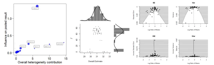 2)异质性检验及发表偏移、漏斗图、雷达图、发表偏倚统计检验