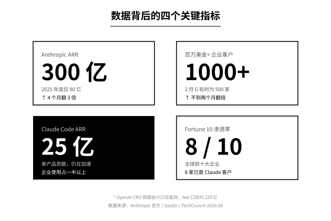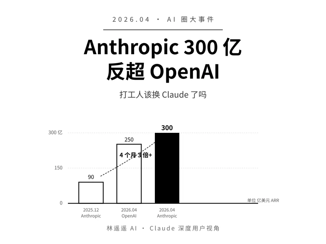 4 月 7 日,Anthropic 官方放出一张图,把所有看 AI 行业的人都噎了一下:年化收入(ARR)300 亿美金,正式超过 OpenAI 的 250 亿。
