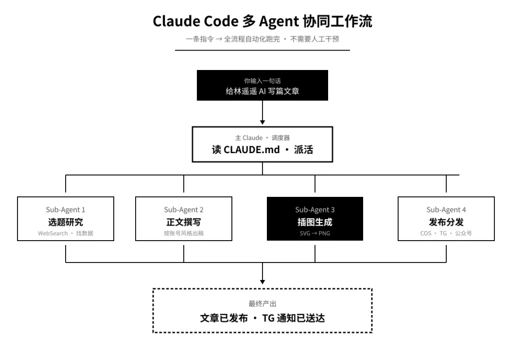 现在用 Claude Code 的 sub-agent 并发:12 个公众号可以同时启动,每个 sub-agent 在自己的上下文里跑完整流程。主 Agent 负责调度和异常处理。理论上限是一次 12 篇同时产出,实际瓶颈在 API 速率限制。