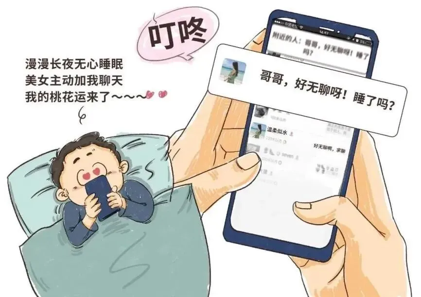 不法分子购买社交平台账号,利用AI生成色情照片,用“哥哥睡了吗?”“视频验证才见面哦”等话术库,24小时群发撒网,寻找目标。