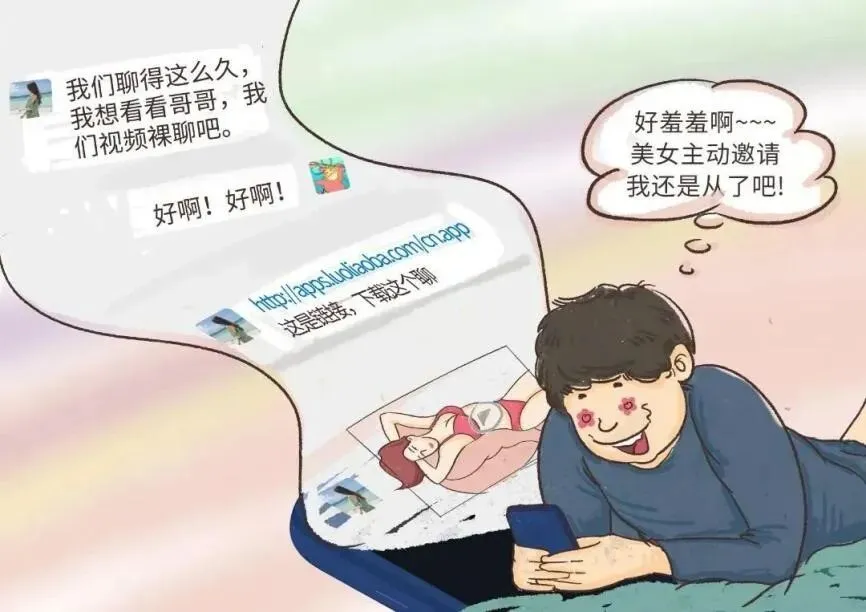 不法分子通过话术诱导受害人下载所谓的“裸聊”“约炮”APP或点击链接。通常其内藏木马病毒,以窃取受害人手机设备信息、手机号码、通讯录、短信等。部分APP会要求受害者“刷单”“充值”,以提供“约炮”机会。