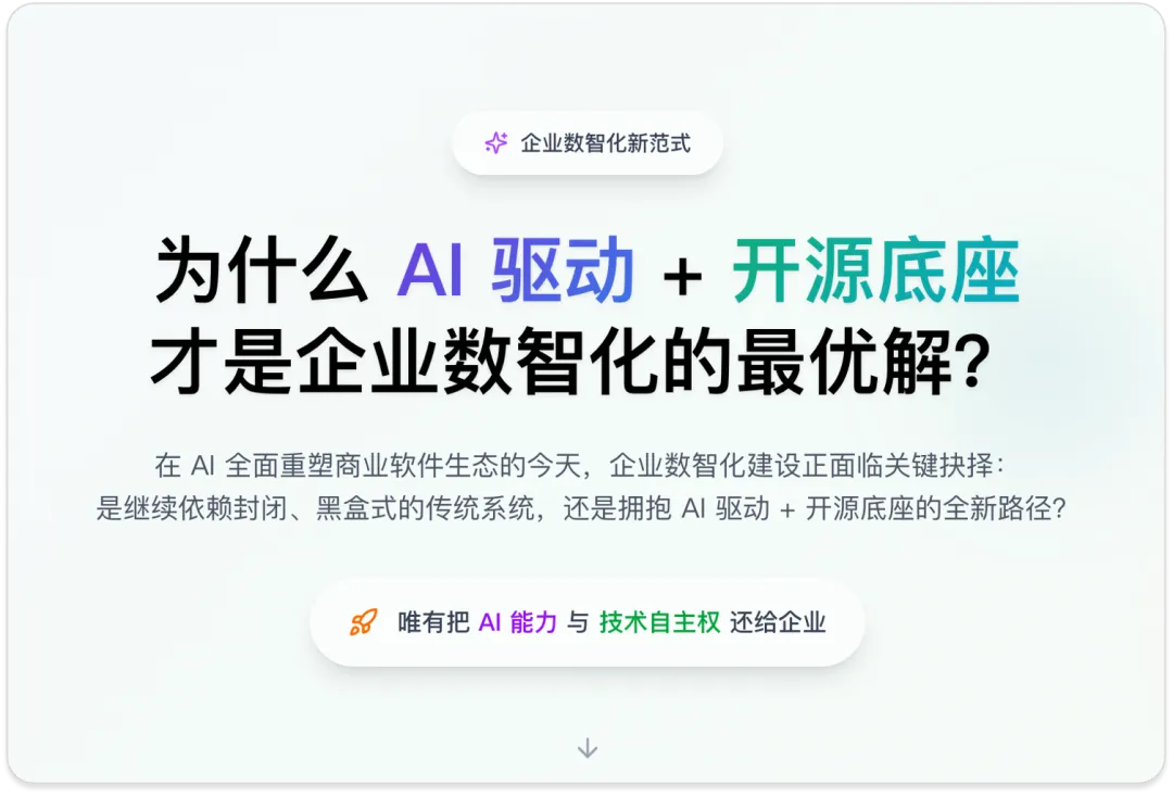 在AI全面重塑商业软件生态的今天,企业数智化建设正面临一个关键抉择:是继续依赖封闭、黑盒式的传统系统,还是拥抱「AI 驱动 + 开源底座」的全新路径?