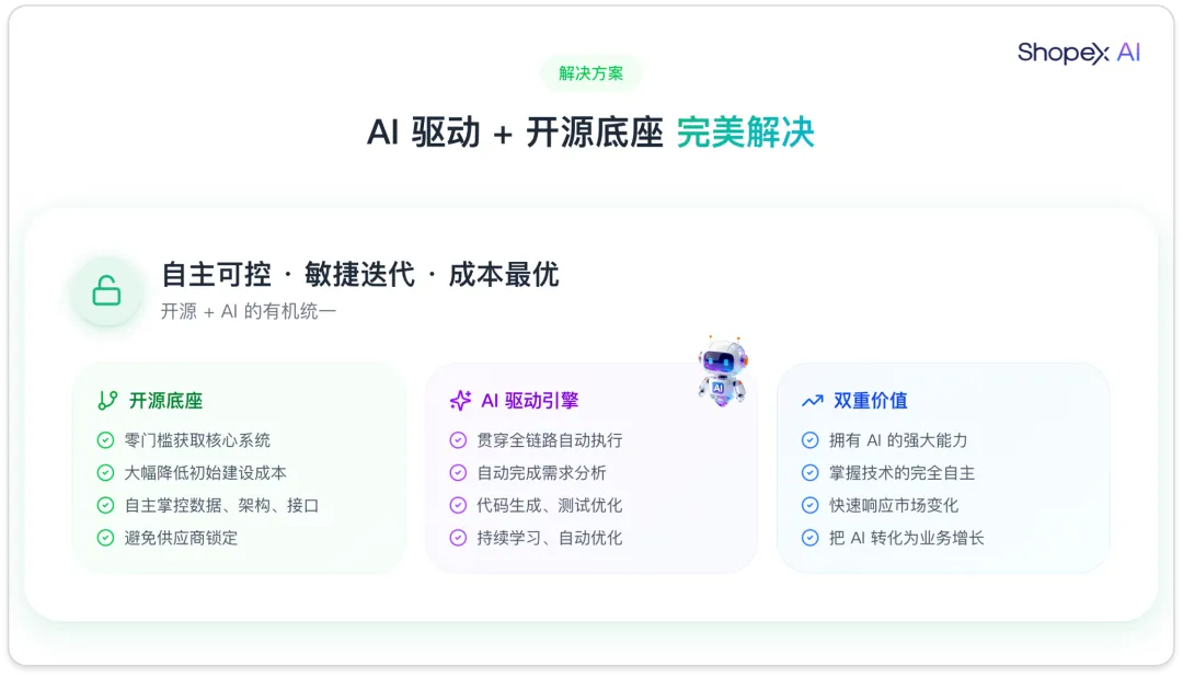 商派的 “AI驱动 +开源底座”,不是简单的代码开放与AI功能叠加,而是一套完整的、面向企业自主数智化的解决方案: