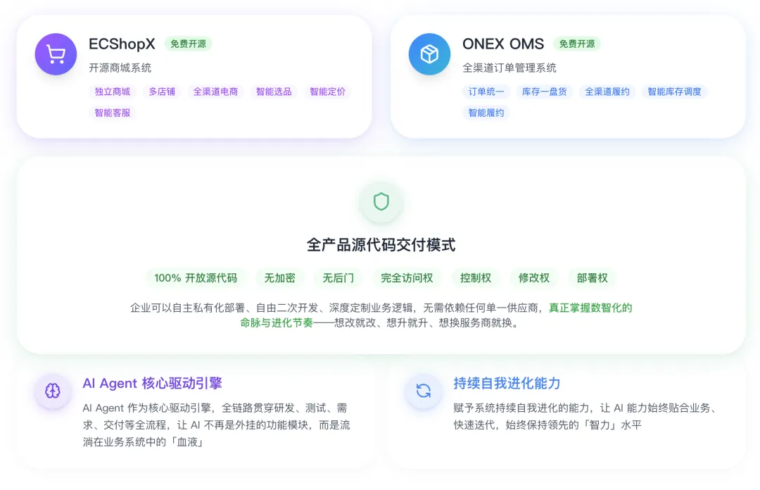 例如,商派免费开源的ECShopX(企业级多模式商城系统)、ONEX OMS(全渠道订单管理系统),都是100% 开放源代码、无加密、无后门,赋予企业对系统的完全访问权、控制权、修改权与部署权。