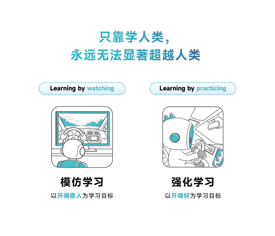 作为物理AI的第一个成熟商业化落地的应用,L4级自动驾驶和Robotaxi对安全性的要求极高,只有远超人类的安全性,才能大规模上路运营并被公众接受。正因如此,小马智行认为自动驾驶模型的训练目标不应是“像人开得一样好”,而是“比人开得好”,这意味着一种范式的变化——从模仿学习到强化学习。