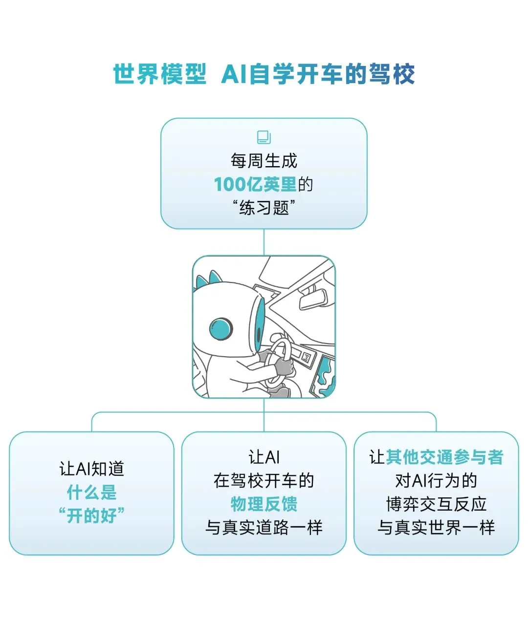 小马智行从2020年起,通过数年时间逐步打造并完善了一套贯穿云端与车端的完整体系,让AI通过强化学习增强模型开车能力,使AI可以在“虚拟驾校”中反复开车、训练车端模型的驾驶能力,这也就是“世界模型”。世界模型不是简单生成虚拟数据的仿真环境,而是一套完整的强化学习训练系统以及开发范式,帮助AI提升驾驶中最重要的博弈交互能力。