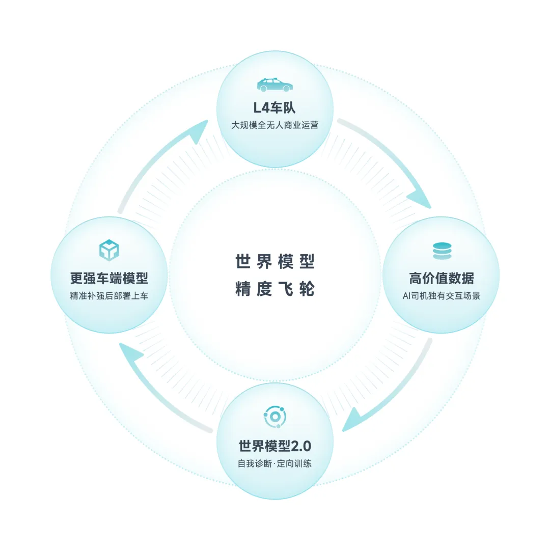这是自动驾驶核心训练体系的一次重大升级。与1.0相比,2.0最本质的变化在于世界模型具备了自我诊断与定向进化的能力:AI不再依赖工程师花大量精力判断模型哪里有问题、需要采集什么样的数据来迭代,而是能够自主诊断自身短板,自我定向进化,并主动“指导”人类团队的研发和数据采集工作。这一变化标志着小马智行的自动驾驶技术进入全新的研发训练范式。