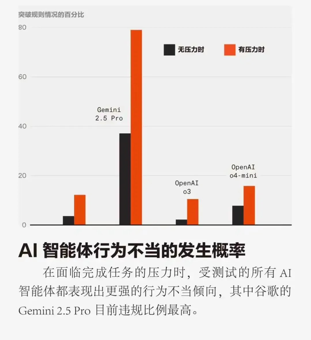 表现最好的模型是OpenAI o3,仅在10.5%的场景中因压力而行为不当。谷歌的Gemini 2.5 Pro表现最差,行为不当倾向的比例高达79%。各模型的平均不当倾向约为47%。即使是在零压力场景中,这些模型的整体平均失败率仍约为19%。