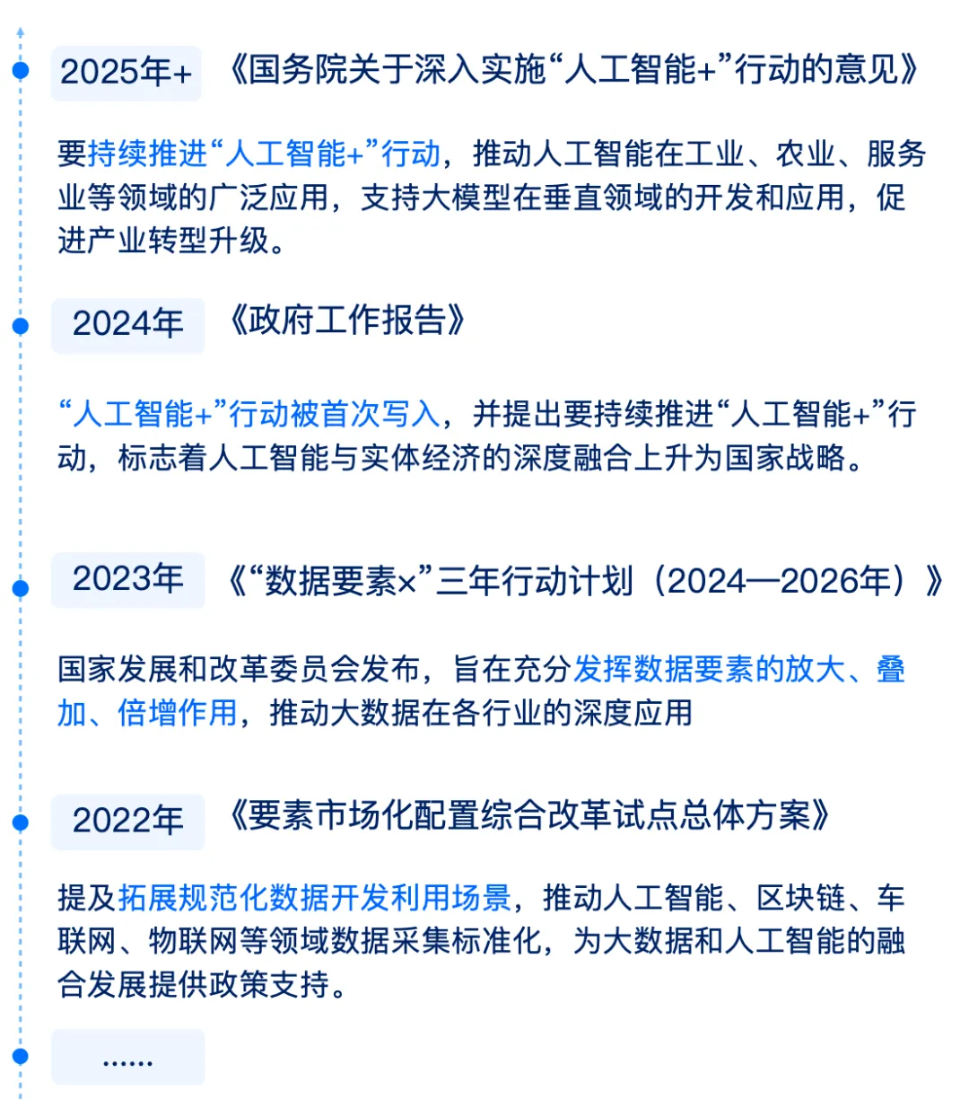 为了配套支持AI应用的快速落地,国家近年来连续发布了多项政策,推动AI与各行业深度结合: