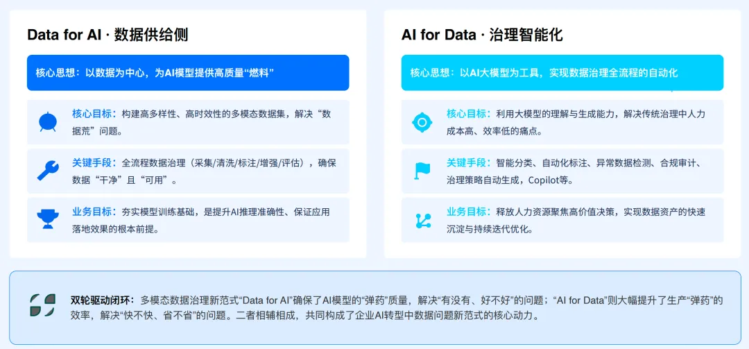 ① 数智一体化:以往数据治理和AI是两套平台建设。未来,数据平台、数据治理和AI平台应合二为一,在平台中内置AI能力(如向量搜索、智能问答、知识库),整合大模型、向量库、搜索引擎等技术组件,通过一道平台满足治理自动化、标注和向量化要求。