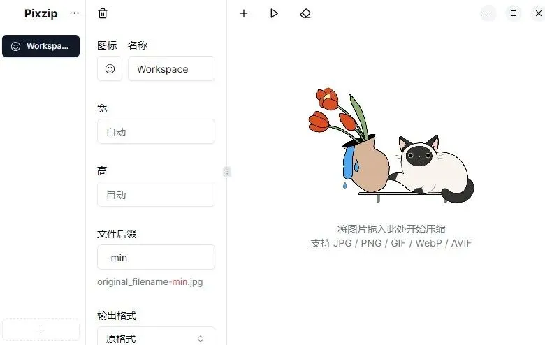 这款图片压缩工具自带工作空间功能,可快速组合切换输出尺寸、格式、压缩强度等参数,支持JPG、PNG、WebP、AVIF等多种格式,压缩效率出色。