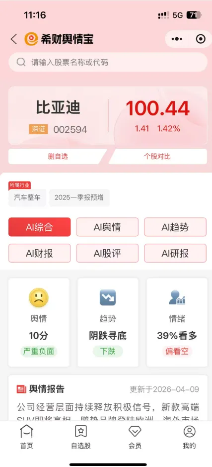 舆情宝每天会生成一份报告,从消息面、技术面五个维度看一只票。AI把全网的资讯、研报、股民讨论、机构观点全抓来,然后用大模型告诉我们这个消息是利好还是利空。