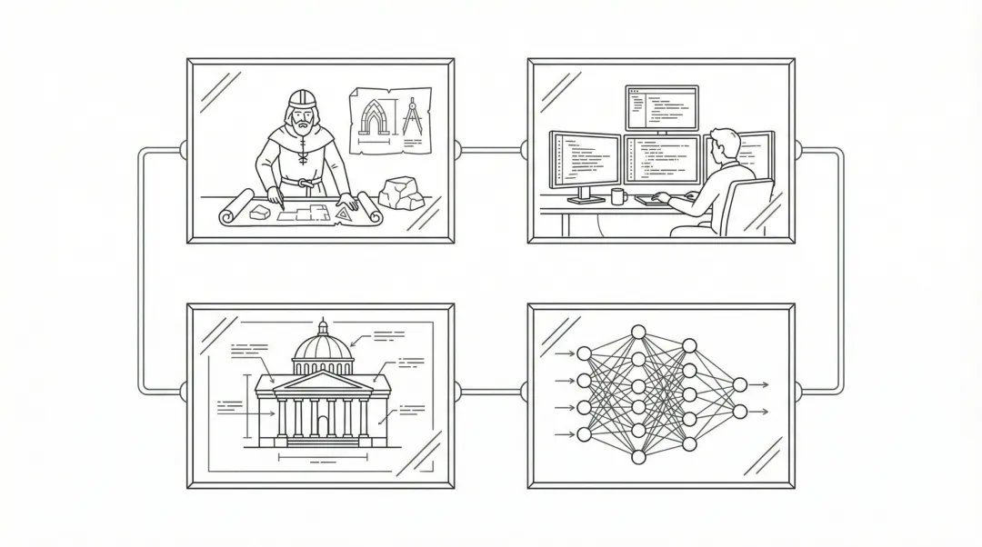 那些能建出哥特式尖顶、精妙飞扶壁的建筑师,被视为接近神明的人物。他们的知识,藏在脑子里、藏在双手里,靠口口相传,从师傅传给徒弟。