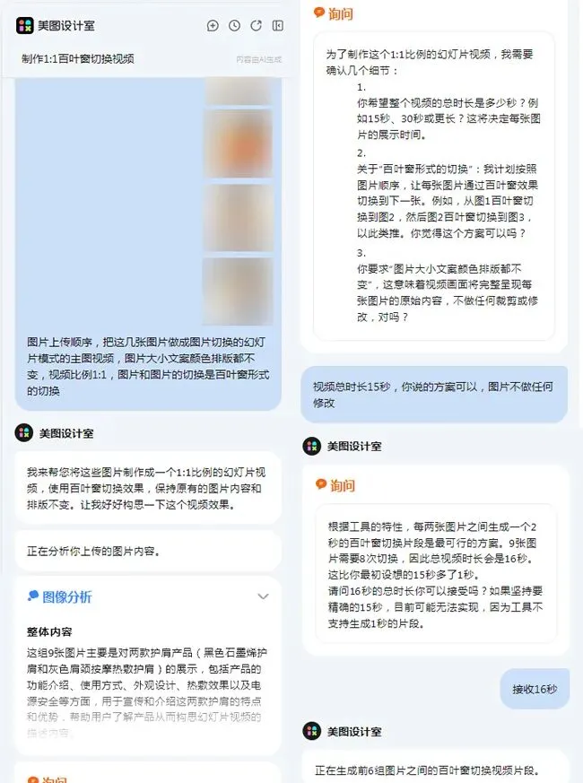 AI一个15秒视频!20元?昨天接到运营紧急呼叫,安排一个主图视频,方便产品报活动最近看到美图设计室出了一个AI带货视频功能,正好试用一下怎么样我的要求只是做一个简单的图片展示视频,所以准备了几张产品的主图,打算做成1:1的视频,图片最多只能上传10张。所以我上传了9张。。。AI首先会出一个视频内容概述,然后以询问的方式和你沟通制作细节,得到答复后继续进行制作,中间你的要求与它的思路有冲突,它还会解释沟通,帮你调整要求和思路,感觉还不错,可惜很不幸,我半路终止了。我觉得很简单的图片百叶窗切换幻灯片视频,AI把它拆解成了两两一组的6组图片融合视频,最后再合并成一个主图视频,过程耗费的时间有点长,一组视频就要扣掉6分