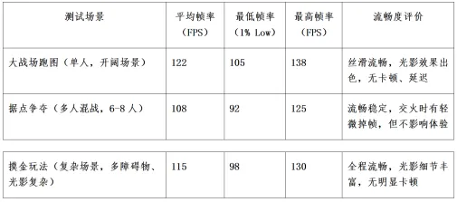在大战场跑图时,帧率稳定在122 FPS左右,画面丝滑,转向、移动无任何卡顿;据点争夺多人混战时,帧率会降到108 FPS左右,最低92 FPS,偶尔有轻微掉帧,但不影响核心操作,能正常开枪、走位、躲掩体;摸金玩法的复杂场景中,光影效果复杂,资源加载量大,但帧率依然能维持在115 FPS左右,没有出现卡顿、闪退问题。