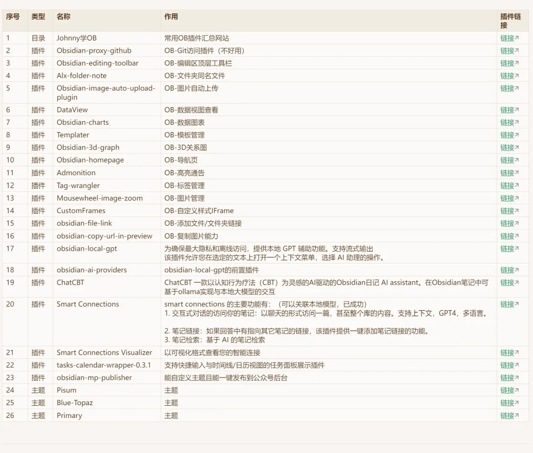 • 学习成本高——这是建立在只把它当记录软件、还是要建工作台的前提上 • 插件太多,兼容性需要考虑,插件更新可能有延迟 • 整体布局和好用的插件需要尝试和摸索 • 默认表格是 Markdown 形式,虽然可借助插件快速粘贴编辑,但刚上手会不习惯(我倒是无所谓) • 图片需要插件管理,默认大小无法调整 • 关联文件默认上传到附件文件夹,如果关联其他文件夹需要手动编写链接,调整位置后要重新更新