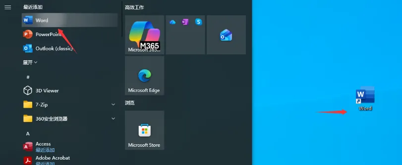 点击电脑“开始”菜单,在“最近添加”的程序列表中找到 Word,用鼠标左键将其拖拽到桌面,即可创建快捷方式。