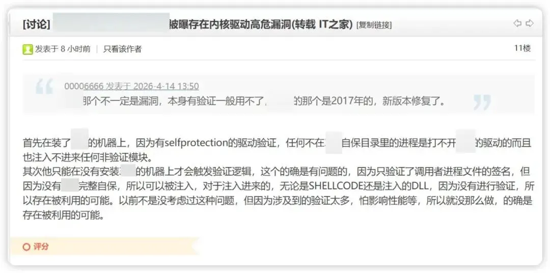核心结论:本次漏洞的本质是「防护软件自身引入的内核级攻击面」,典型的 BYOVD(自带易受攻击驱动)利用素材。任意本地代码执行后,攻击者可借此一步提权至 SYSTEM,同时获得内核内存读写能力。研判:在企业和高价值个人用户场景中,风险等级高;在纯远程场景下,需配合前置漏洞才能触发。事件不需要制造恐慌,但有装机量基础的防护产品引入内核攻击面是专业过失,须认真对待。