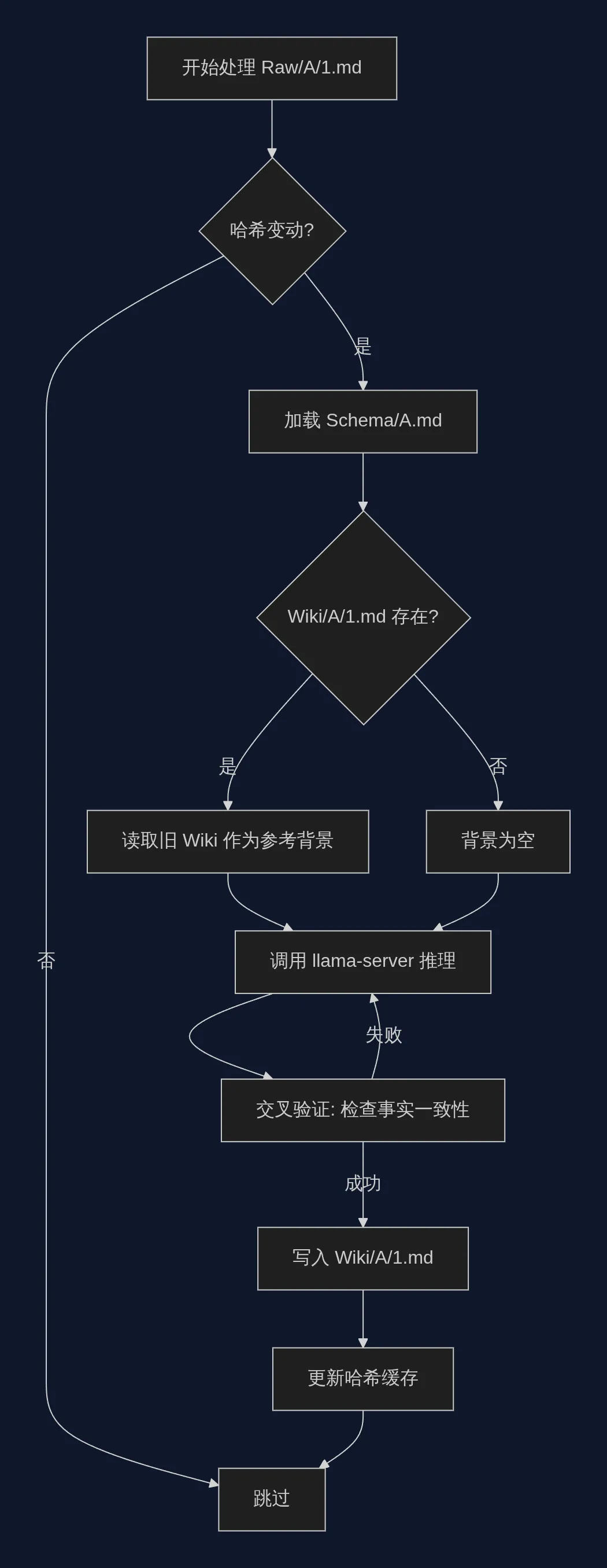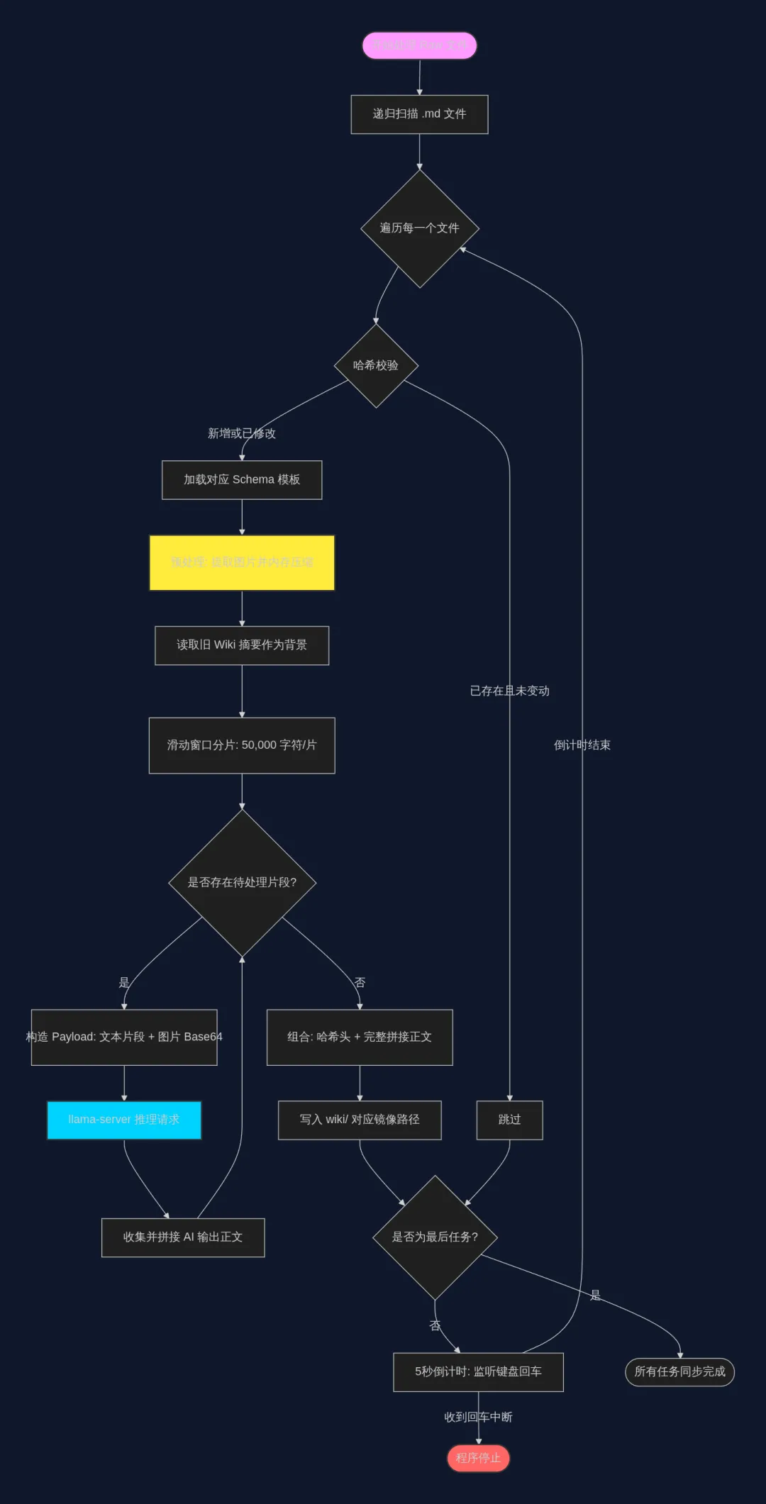 至于为什么用这些dependencies?我只是给了gemini详细的功能解释和大致的逻辑示意图,它告诉我需要这些dependencies来实现而已。也许会有更好的工具,不过那是之后优化的工作了。 之后我随便从wikipedia上找了两篇wiki文章丢入一个文件夹进行测试,结果发现只输出了一篇wiki.md。于是回头查看llama.cpp的日志发现其中一篇的字数过多超出了我设置的32k上下文,导致中断。考虑到测试阶段,没有增加上下文容量,而是选择对源文件进行切片。根据设定的字节数(1 token约等于4字节)来对文章切片,而且我担心会丢失上下文导致输出错误,又加入了窗口滑动来防止语境断裂。 再次测试,发现课堂笔记里有太多的图片,这些图片会导致token数暴增,又因为我使用的是gguf,没有下载多模态组件。于是我加入了对图片进行格式转换和压缩(png to jpg),在保证可读性的情况下压缩图片容量。虽然对于生成速度没有帮助,但是对于上下文以及预处理时间非常有帮助。 同时也突然想起来没有设置任何中断机制,因此增加了每次生成完倒计时5秒,如果5秒内输入换行符(回车)就中断操作的机制。 为了防止日后上下文太多而爆炸,增加了给已经生成的wiki写入摘要(方便llm使用)和哈希码(方便llm查询)的功能(哈希码是gemini推荐的)。 至此,大致功能就都已经实现,当有新的文件输入时,llm会通过更新和比对来进行增减,同时它能自我更新知识,并且应该不会有长上下文失忆的问题。 接下来就是如何lint这些wiki文件,以及如何优化和自动化的更彻底。或者等想到什么新功能了再加进去。