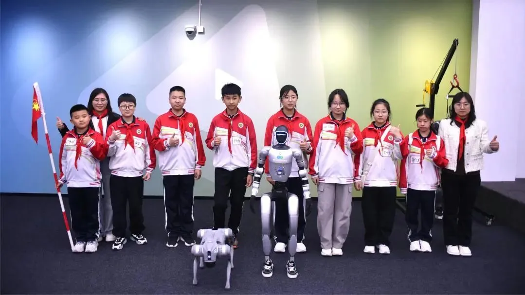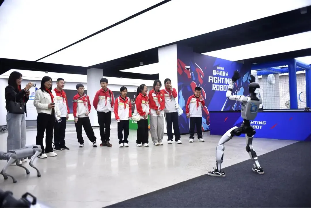 AI应用场景区更是成为了少先队员们的“快乐星球”,趣味体验接连升级。在具身机器人互动区,灵活灵动的机器人随着指令做出翻滚、握手、跳舞等动作,精准的肢体协调能力让队员们赞叹不已,大家纷纷围拢过来,主动与机器人互动合影,欢声笑语传遍场馆每个角落。