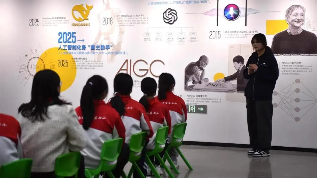 走进AI序厅,“AI时光机”沿着时间线,全景展现了人工智能从图灵测试到大模型时代的演进历程,队员们驻足凝视、认真聆听,不时举手提问,在互动问答中初步解锁AI的起源与发展密码。